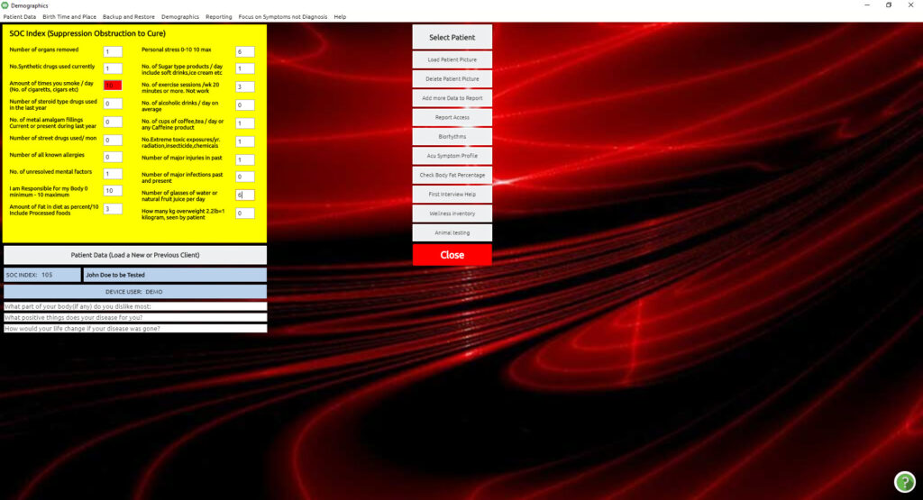 The SOC questionnaire is done for educational and not medical purposes. It is used to raise client awareness and acquire an understanding of any areas of stress. When the SOC information is entered, the PULSAR program can now individuate to the specifics of the client. This ensures that the program will be more specific to the client as opposed to running generically. Certain answers may prompt other buttons to appear. Filling in the SOC will also provide an essential opportunity to dialogue, educate and develop a rapport with the client. Here we are building a relationship with the client.